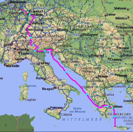 Hier die Route, die Flecken sind die Übernachtungsstellen.